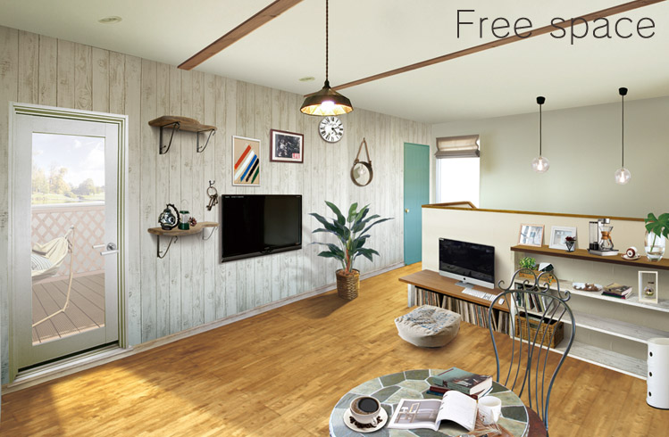 白を基調とした空間に、ナチュラルな木目が彩りを添えます。フリースペースだから、広さを活かしてセカンドリビングに。家族で楽しむ趣味スペースに。仕切りを作ることで子供室にも。楽しみが広がる、機能的なスペース。